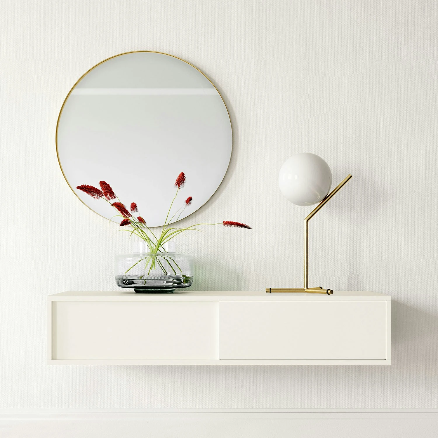 - Frame van gelakt MDF, schuifdeuren van messingkleurig aluminium en/of gelakt MDF en dient schoongemaakt te worden met een vochtige doek